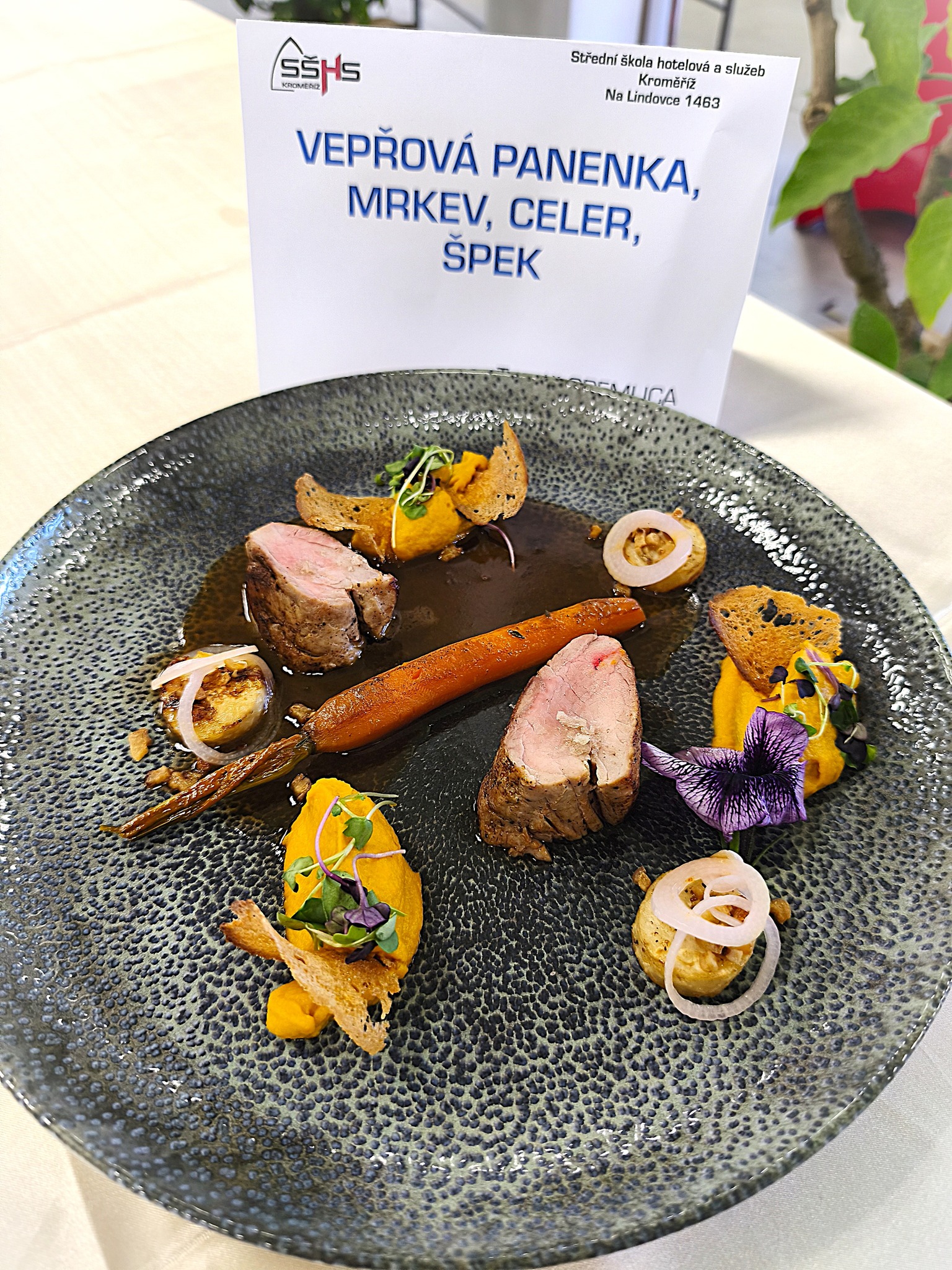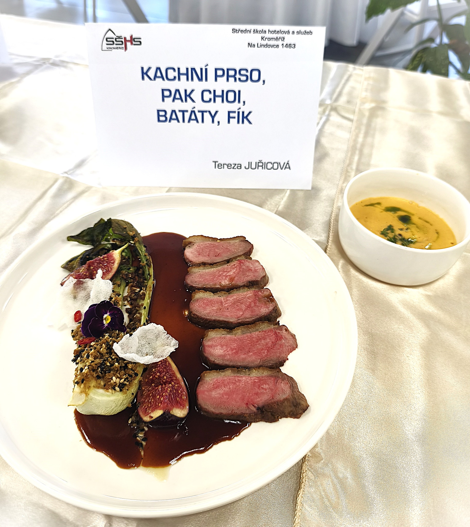 Naši školu v kategorii Kuchař kadet reprezentovaly dvě soutěžní dvojice - Tereza Juřicová s commis Martinou Župkovou ze třídy 2.E a Tomáš Gremlica s commis Tetianou Krokou ze třídy 2.B. Soutěžící měli za úkol připravit během 45 minut 3 porce libovolného moderního teplého pokrmu. Tereza připravovala kachní prsa s grilovaným pak choi, fíky a espumu z batátů. Tomášovým soutěžním jídlem byla vepřová panenka, mrkvové pyré, celer a škvarky.
